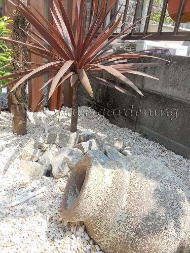 南国を思わせる植栽 琉球石灰岩 白砂利でリゾート感を 豊島区s様邸 洋風ガーデン 芝生の庭 雑草対策 防草シート 砂利敷きその他 の施工例 千葉県 東京都の造園 植栽 庭施工 造園業専門店 新美園