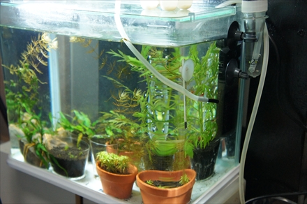 弱肉強食の水草ストック水槽に稚エビが ドリリウム