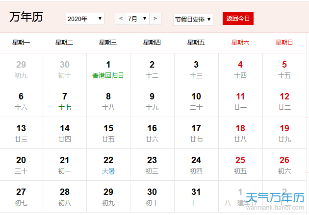2020年7月黄历表查询2020年7月份农历阳历一览表 万年历