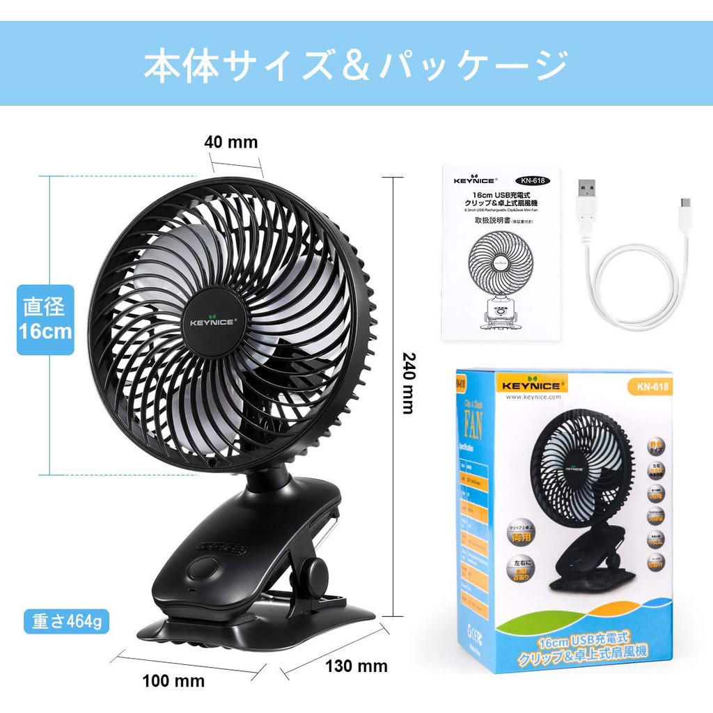 Amazon Keynice Usb扇風機 自動首振り 静音 クリップ 卓上 小型 リズム 充電式 壁掛け Usbファン 風量4段階調節 長時間連続使用 日本語取扱説明書付 ブラック Keynice 卓上扇風機